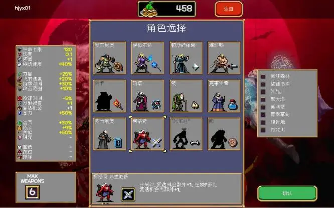 但戰敗只是遊戲的開始——首先在遊戲結算環節我們會發現了自己解鎖了一大堆內容,然後發現金幣可以購買很多角色強化的項目:比如初始的血量、護甲、攻擊力等等......甚至是復活的機會和「投射物」的數量。在重複可玩性的激勵方面,《吸血鬼倖存者》除了類似於哈迪斯的鏡子解鎖,還有一點很好的經驗在於:把所有的「遊戲成就」內容都綁定了切實的獎勵,包括了新英雄、新物品、新地圖甚至是新遊戲模式的解鎖,還有金錢和其他物品的獎勵。那麼一種自然的情緒油然而生:有了更強的屬性、更多的可用道具、更多的可用英雄人物,我們再一次的挑戰,結果是否會不一樣呢?