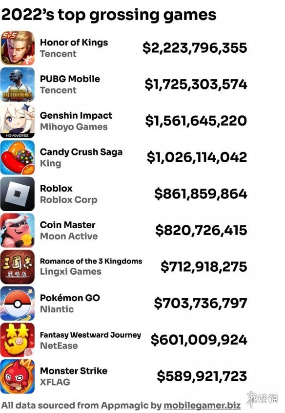 移動應用市場研究公司Appmagic公布了2022年全球收入最高的前20款手游,按照Appmagic的統計,在去年全球收入排名前十的手游中,5款由中國廠商發行,分別是《王者榮耀》《PUBG Mobile》《原神》《三國志・戰略版》和《夢幻西遊》。