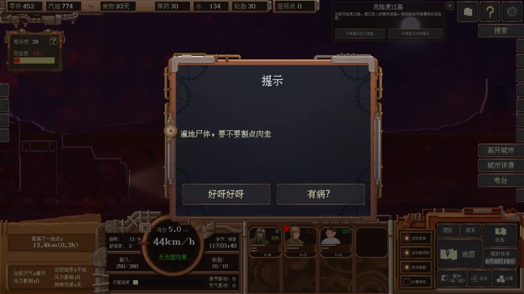 很怪,打完架有概率觸發割喪屍肉的選項,原本以為是拿來做菜的,結果沒想到是拿來打架逃跑的,成功率是50%左右,節省汽油好幫手。