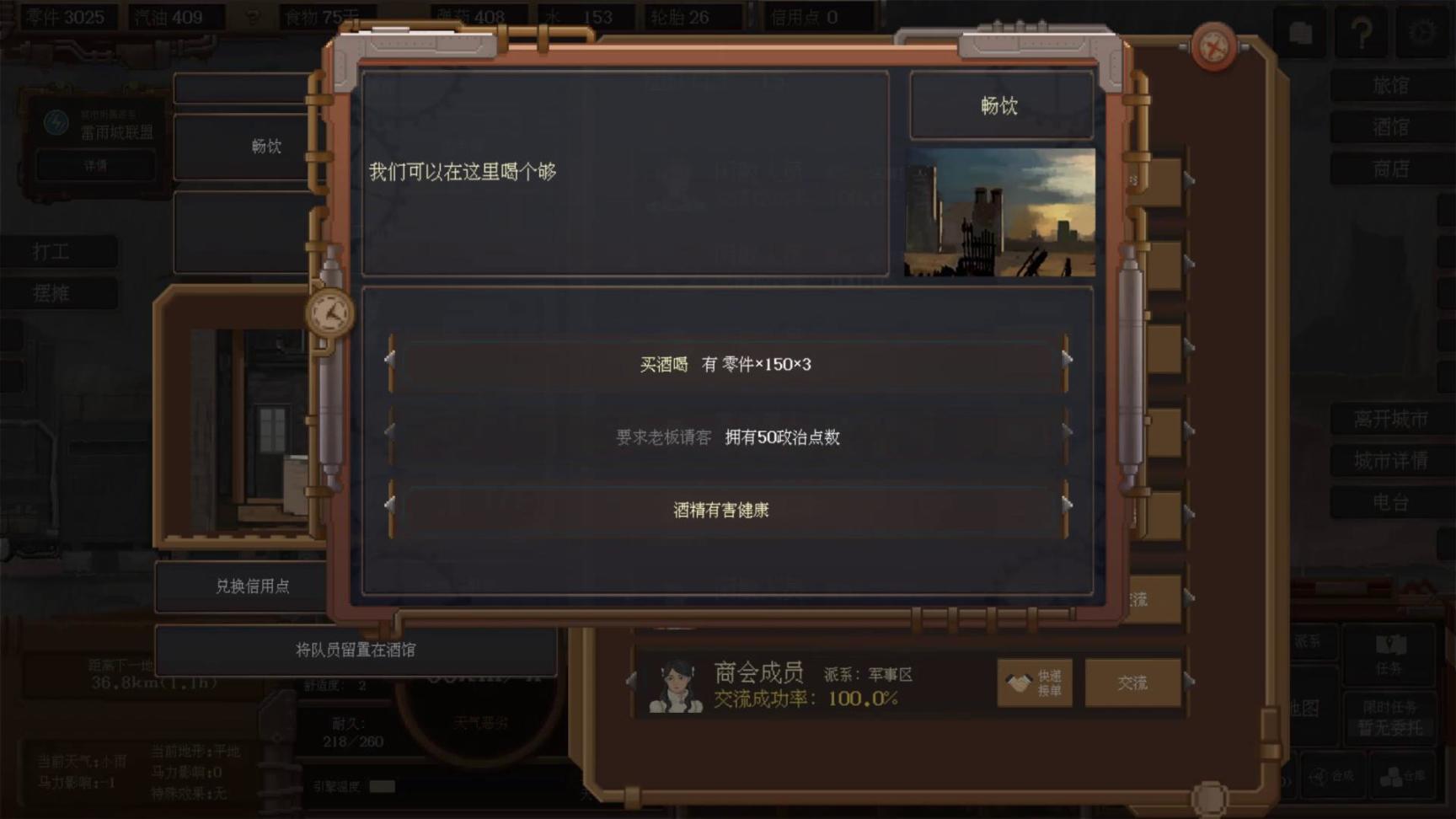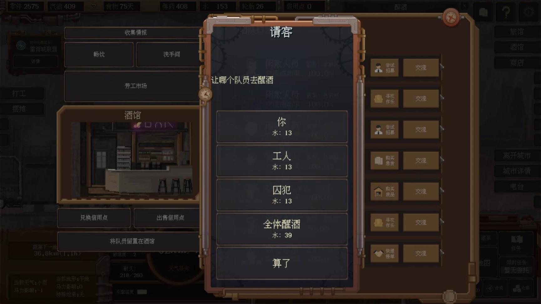 城市的酒館增加暢飲與洗手間,只要付出一些零件(貨幣)就能全員喝一杯,比單純喝酒劃算很多,釋放團隊壓力好去處。