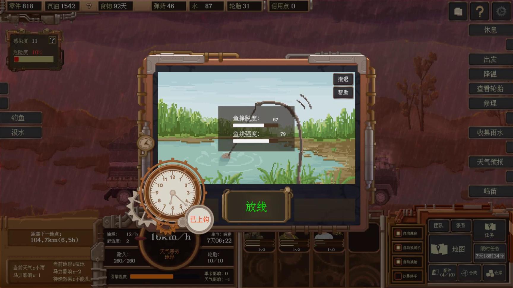 河流地形的玩法比較刺激,新增了釣魚系統,屬於比較容易血壓升高的玩法。你需要頻繁進行收線與放線,一方面要防止魚掙脫,一方面要防止魚竿斷裂。稍不注意,遊戲就GG。