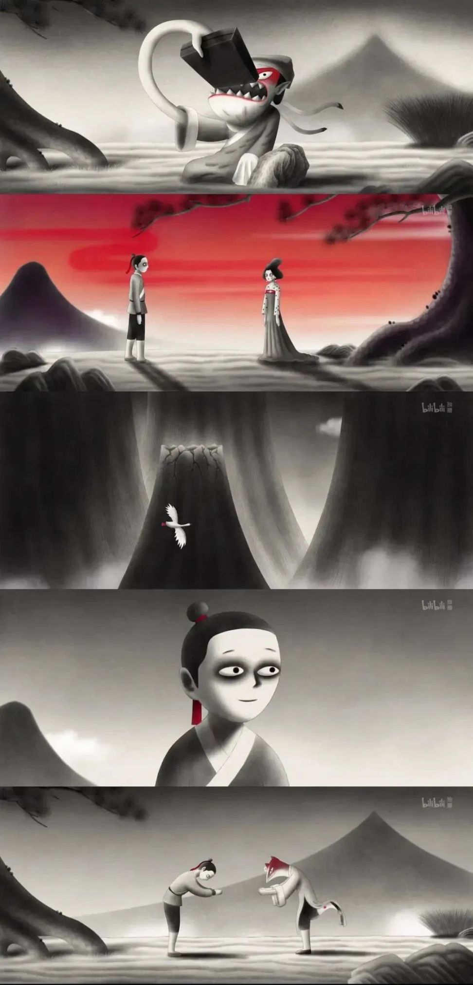 而第二集《鵝鵝鵝》用默劇的形式、詭異綺麗的畫風再配合聊齋味道濃烈的故事,就更是把寫意、留白、說話說一半的傳統味道發揮了出來: