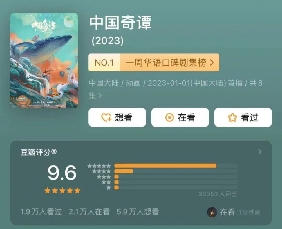 而且實際在播出第一集《小妖怪的夏天》後,《中國奇譚》直介面碑爆炸,表現非常驚艷,截至目前有超3萬名網友在豆瓣上做出評價,已經獲得了9.6的高分。