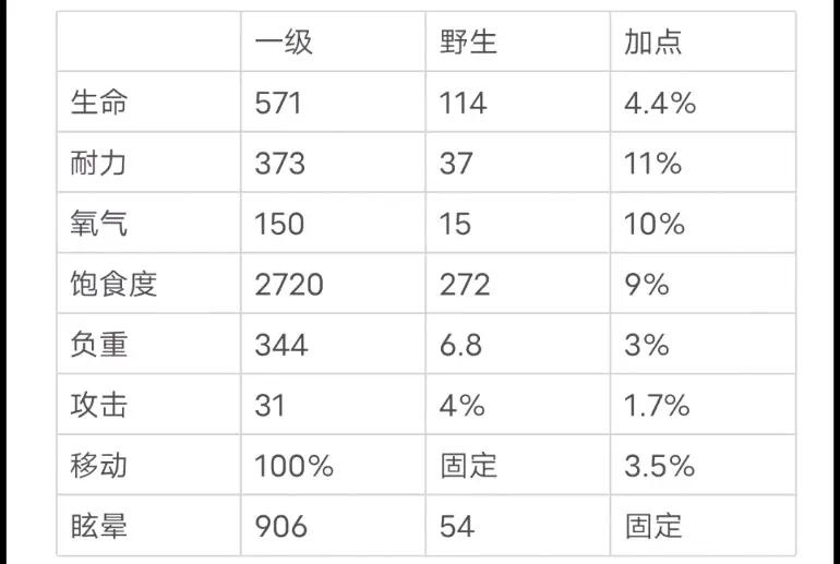 「一級」代表野生狀態下1級時的屬性,「野生」代表野生每級增加的值,「加點」代表馴服後每級增加的值。