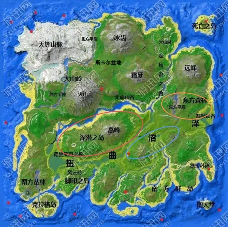 虔州龍分布範圍(紅圈最多,黃圈次之,藍圈最少)