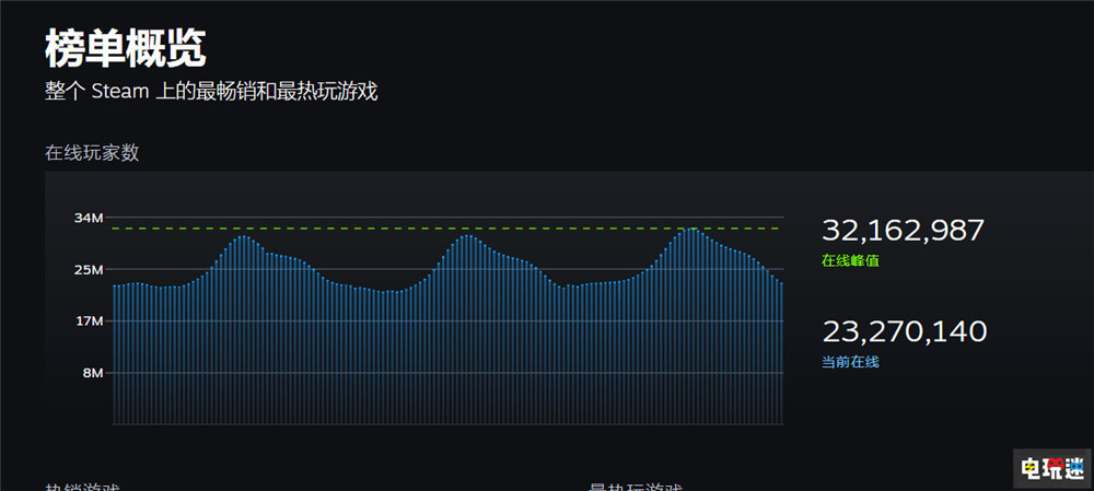 Steam是真的新年開門紅,根據SteamDB的統計,在2023年1月7日,Steam的全球在線人數峰值已經突破3200萬,創下單日在線的新紀錄。同時Steam的「游戲中」的玩家數也達到了1000萬大關。