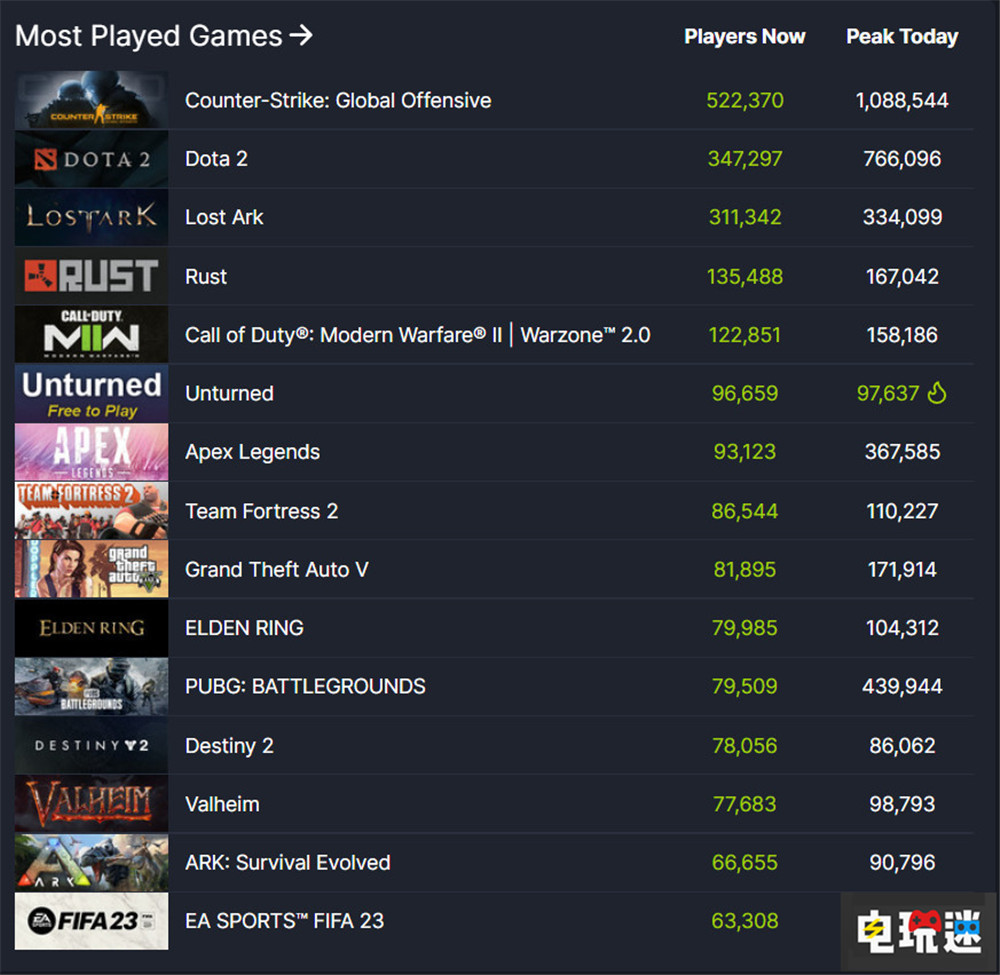 當然作為這其中的中堅力量,游戲中的玩家數包括了所有打開游戲應用的玩家。其中就包括了基數龐大的各大免費在線游戲,從玩家數榜單也能夠看出,前三名的依舊是Valve自家的《CS:GO》、《DOTA2》以及《失落方舟》,神仙打架的《腐蝕》與「歐美喜愛福」《使命召喚 現代戰爭》(2022)這兩款線上突突突的作品也位列前五。