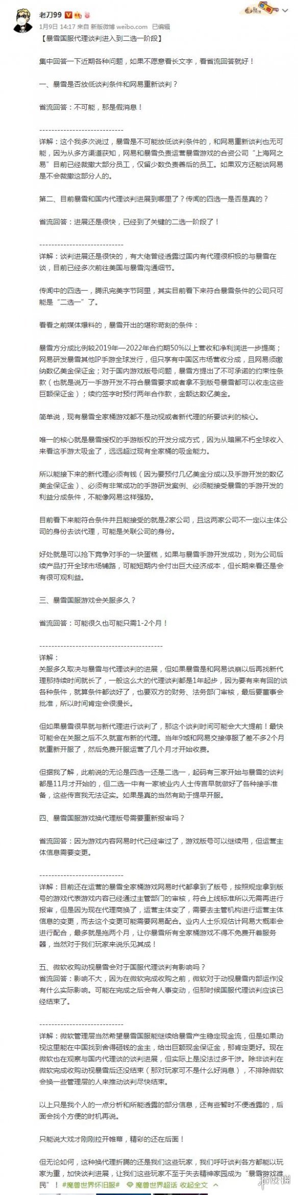 今日,《魔獸世界》消息爆料人、行業從業人員「老刀99」發文稱,目前暴雪和國內代理談判進展迅速,已經進入"二選一"階段,有大佬曾經透露過,國內有代理很積極的與暴雪在談,目前已經多次前往美國與暴雪溝通細節。另外,傳聞中的四選一,騰訊完美位元組阿里,其實目前看下來符合暴雪條件的公司只可能是「二選一」了。