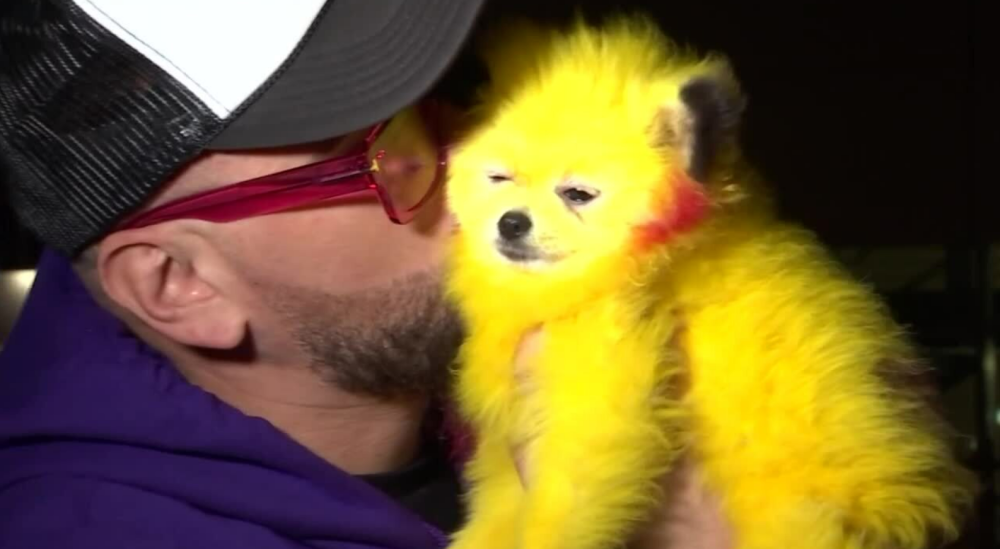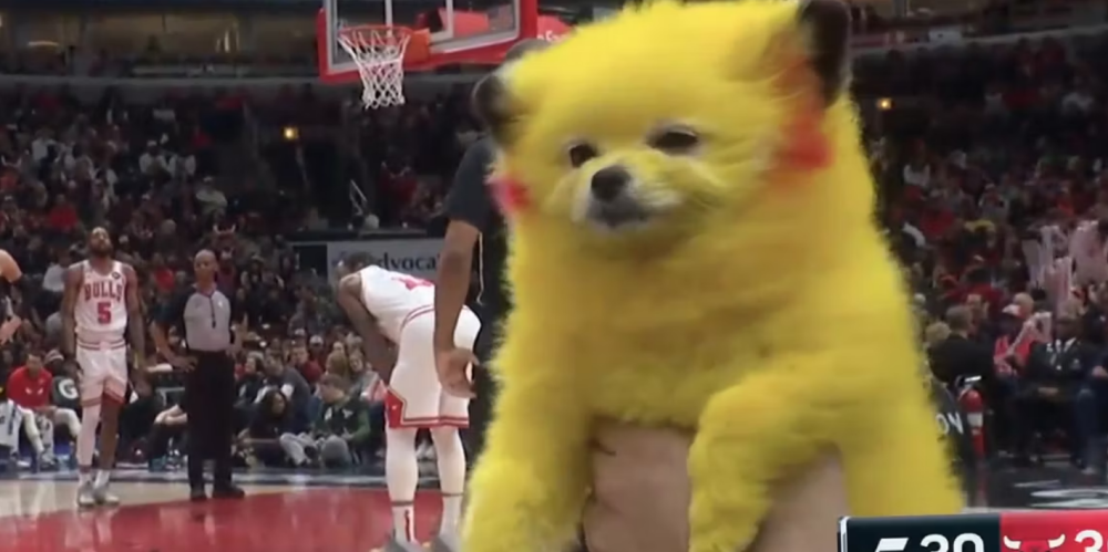 在上個月,邁阿密熱火隊VS明尼蘇達森林狼隊的一場NBA比賽中,轉播鏡頭捕捉到一隻造型花哨的博美犬,除臉部的幾搓毛,它通體被染成黃色,扮成《寶可夢》皮卡丘的樣子,十分可愛。然後,解說員們驚呆了,這隻博美也迅速成為網紅犬,其相關視頻被觀看數百萬次。