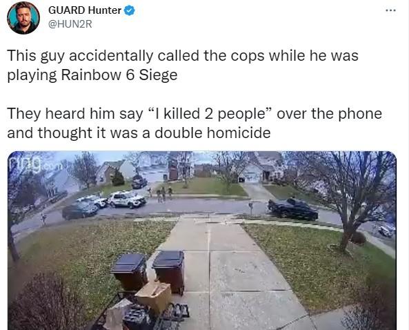 近日美國主播Guard Hunter披露,一位名叫Elijah的玩家在與好友開黑《彩虹六號:圍攻》時,不小心用手機撥打了911(手機處於鎖屏狀態但誤觸緊急呼叫)報警電話,不巧的是警察接線後,聽到他大喊「我殺了兩個人」,於是警察迅速出警。