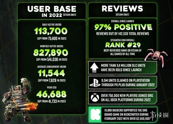 此外,《深岩銀河》在2022年1月份加入PS+會免,當月領取次數超過950萬次。而在2022年內,有超過75萬名新玩家通過Xbox平台遊玩了這款游戲。
