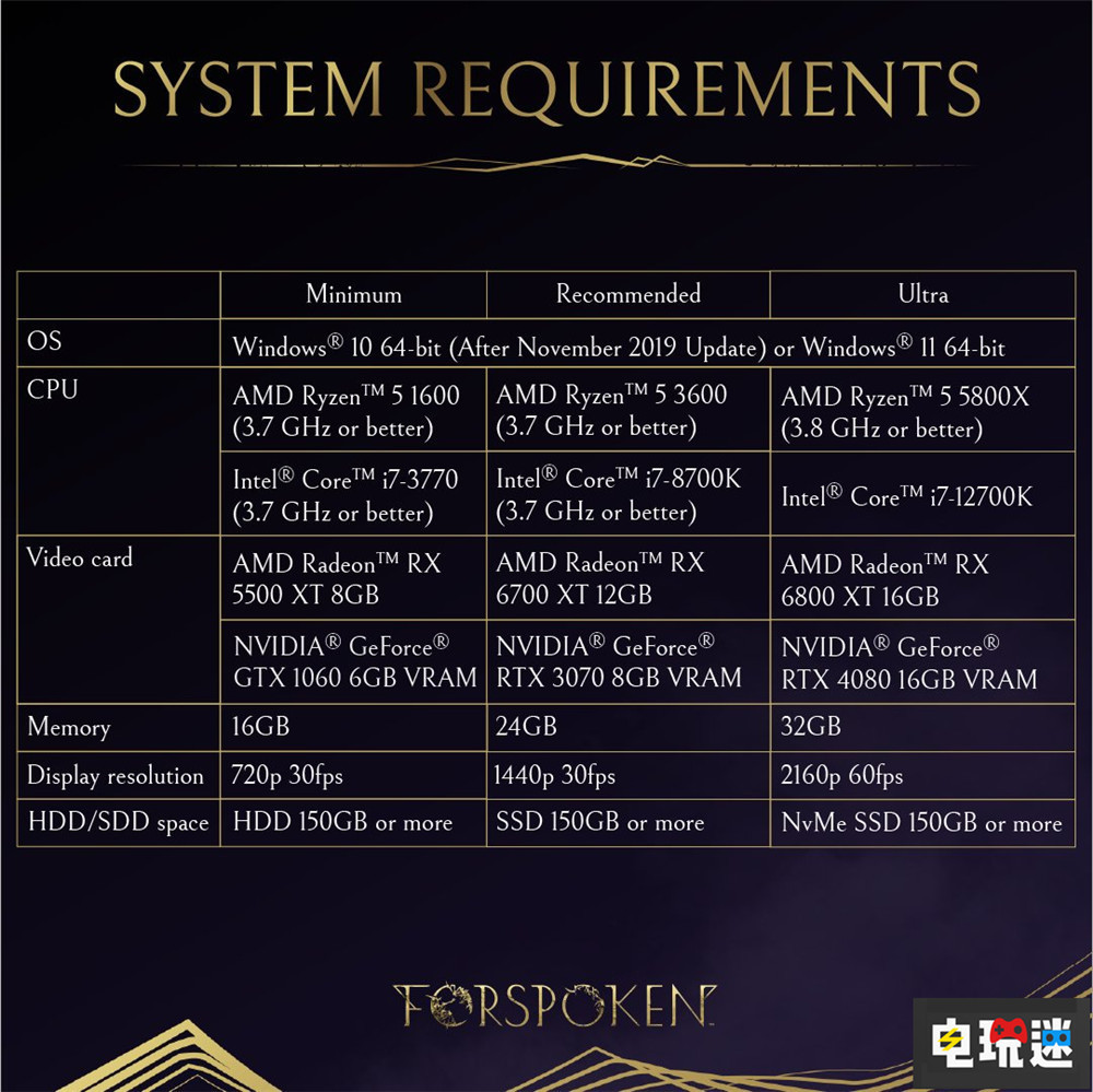 《Forspoken》PC版硬體需求的最高配置下達到4K60fps需要GTX 4080顯卡與32GB內存;推薦配置下達到1440p30fps需要GTX3070顯卡與24GB內存;最低配置則需要GTX1060顯卡與16GB內存。