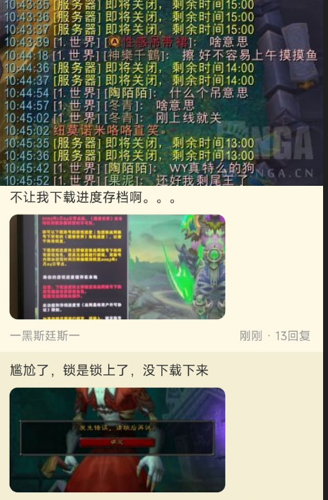 雖然距離1月24日關服只有3天左右時間,但依然有諸多國服玩家為迎接這次短暫的挑戰,進行了大量准備。NGA論壇有人抱怨「視頻攻略看了四五個小時,三個號准備了6組合劑,300瓶藥水,9組魚,12萬金,還特意買了猛獁給開荒團修裝備,現在都用不上了,心裡難受。」而大家憤怒根源,是網易負責人張棟之前給出的信息,話說得太滿,大家以為國服更新已板上釘釘。