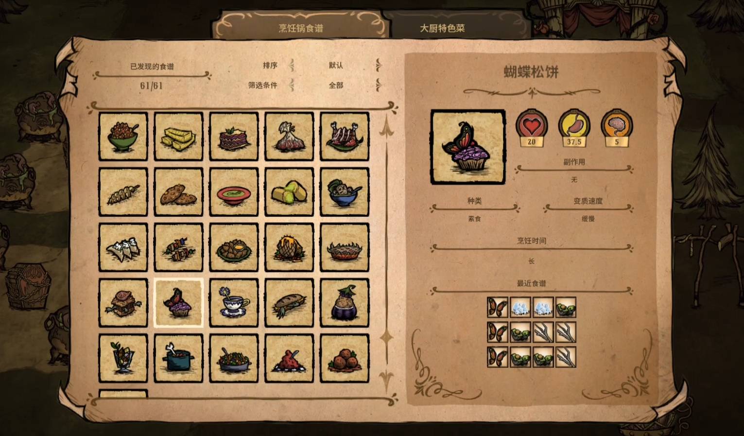 料理性價比:3。要是用1個翅膀1個蘿卜2個漿果做的話,飽食度都不用看了,只是回血多了些,可是做蝴蝶松餅要鍋,放鍋里要等......