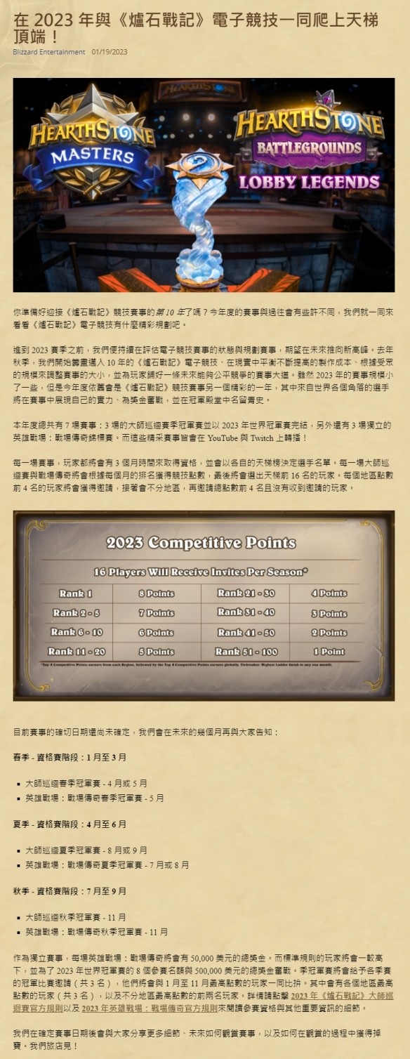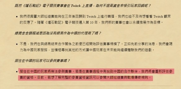 《爐石傳說》官方今日公開了2023年爐石賽事的比賽規則,除了正常的賽事規則介紹之外,在常見 Q&A 部分還表示「居住在中國的玩家將無法參與賽事。若是在賽事過程中有找到中國的合作夥伴,我們將會重新評估參賽的資格。」