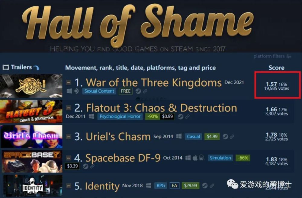 2021年12月份的時候,博士和大家分享了文章《三國殺仗義出手,搶到差評遊戲排行榜冠軍,科樂美:謝謝啊》,介紹了數據網站Steam250統計的一份Steam恥辱殿堂(Hall of Shame)榜單的變動情況。科樂美旗下的足球遊戲《eFootball 2022》本來以14%左右的好評率占據著差評榜的第一名,誰知道《三國殺》「不甘人後」,推出後迅速以8%左右的好評率完成了登頂。