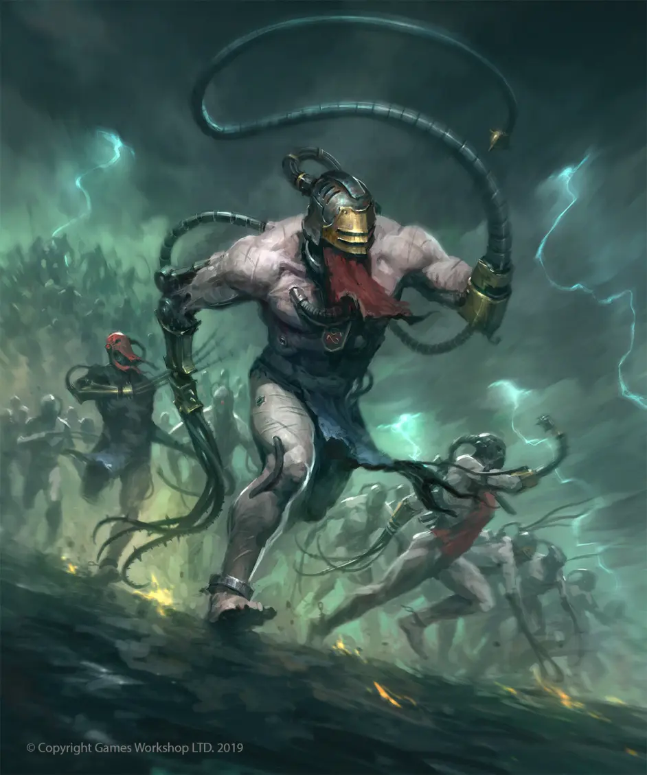 」試想一下,你的四肢將被移除,取而代之的是電鞭或切割爪。雙目被從你的眼窩裡扣出來,用彩色的玻璃填補進空出的窟窿里。大量興奮劑注射器和神經性腺體被植入你的心臟和臟器。最後,為你煥然一新的身體感到自豪吧,你那隻會流口水的愚蠢腦袋將被廢物利用造福帝國。只要我一聲令下,你就會心甘情願地奔赴地獄之門,化作一台狂暴的活體機器,擁抱漫長的死亡。 」——殉道女士修會下屬潔天使小隊隊長 戰斗修女 米莉亞 鞭笞之刑算是死刑的一種,通常是由國教或宗教裁判所認定一個骯臟的異端尚且值得救贖(最常見的是用來懲罰那些表達異端觀點、言論或進行異端行為的人),就會由機械教的機械神甫將其轉化成活體武器(只適用於科技發達的世界中的罪犯,因為要用到先進的科技,甚至是黑暗時代的技術),如此奢侈的懲罰,目的是從肉體上清除異端靈魂中的罪惡,讓這些異教徒能在戰場彌補他們過去所犯下的錯誤(血祭血神,不是,為了帝皇!)。懺悔引擎(Penitent Engines)(如果鞭笞機仆算是星際戰士的話,懺悔引擎就如同是無畏機甲)也是同理,不過那往往是對罪孽更加深重之人(失寵的牧師或是害死隊友的戰斗修女)的懲罰 。這些罪犯將在一場旨在凈化他們靈魂的漫長又極其痛苦的酷刑儀式後被安樂死。在改造成鞭笞機仆的過程中,異教徒需要經歷復雜殘酷的手術(沒有麻醉)和永無休止的精神洗禮。異教徒的雙臂將被切除,取而代之的是可以植入多種武器,例如切割爪、動力鶴嘴鋤和電鞭(最受歡迎)等。此外還會進行額葉切除手術,並將他的前額葉皮燒焦,消除任何保留高級思維的可能性。值得注意的是,這部分通常被放在手術的最後進行,就是為了讓他們充分感受手術的痛苦以作懲罰。罪犯的皮膚,肌肉,神經組織被一層層剝開,機械神甫用強化骨頭,人造纖維束肌肉,神經控制植入物替換掉原有的有機組織。他能感覺到每一次移植器官的插入,每一次螺栓向下刺入骨頭,每一次暴露的神經被拼接在一起的極致痛苦。之後,他的頂部頭骨被移除,神聖的聖油被滴入大腦,被一次塗抹,機械神甫便會頌念一遍16位聖人的名字。機械刀片挖出了他的眼睛,具有復雜的瞄準陣列,光譜威脅分析儀,視覺認知的球體代替了他的眼睛。罪犯四肢被束縛,無法動彈,只能眼睜睜的看著自己整個人被削去重塑。 鞭笞機仆配備了一個用來控制半機械人的密封的安魂頭盔(名字自己瞎取得,一種思維脈沖裝置),外形相當於被切掉的頭蓋骨,與剩下的額葉相連,一整組植入脊椎的化學注射器。平時待機狀態的鞭笞機仆,會通過葯物注射泵注射藥劑,使他保持平靜並處於無意識的狀態,與外界完全隔離開來。這種狀態下鞭笞機仆的腦海中看不見的發聲器不斷重復著,充滿了神聖的圖像,詩句和帝國崇拜的元素,例如國教的象徵、聖徒的畫像、循環的贊美詩、祈禱文和牧師的佈道等等,這些都會直接灌輸進異教徒的潛意識里,讓其時刻感受帝皇的偉大。在這漫長而痛苦的過程中,罪犯的思想將被完全抹去,取而代之的是一種無法控制的衝動,要將他們的獵物撕成碎片的衝動。「雷神之血是你的膏油,在雷神之血中你將覺醒。」——手術完成成群結隊的鞭笞機仆經常被國教和異端審判庭用作突擊部隊,執行例如自殺式沖鋒的任務。每當需要他們戰斗時,安魂頭盔就可以通過觸發神聖的觸發詞的方式來開啟和關閉,解除對其大腦的抑制。鞭笞機仆一旦被激活幾乎是勢不可擋的,當敵人被發現時,戰斗葯物和止痛藥物會同時注入他們的脊椎,賦予鞭笞機仆巨大的力量、速度和耐力,免疫疼痛,即使受到巨大傷害也不影響戰斗。由腎上腺興奮劑的刺激和神經殺傷信號的強力混合物驅使他們陷入無法控制的狂怒 ,化身成只知道殺戮的戰斗瘋子,他們像鞭子一樣的四肢來回擺動,用植入的電鞭或切割爪,砍砍砍,殺殺殺,直到敵人只剩下一堆殘缺不全的屍體。簡直就是帝國的恐虐狂戰士。審判官可以向紅衣主教申請一到兩個鞭笞機仆交給他們的管轄。鞭笞機仆是一種微妙的武器,他們深受某些不在乎附帶損害或殃及無辜的血腥審判官的喜愛。星界軍也很喜歡這些高級炮灰,所以某些與教會關系密切的指揮官也可以搞到一些,鞭笞機仆被成群結隊地投入戰場,與忠誠派的軍隊並肩作戰,安魂頭盔將只允許他們看到任何沒有被其主人標記為友好的人。鞭笞機仆會沖向他所能看到的最近的生物並將其撕成碎片,完全不考慮自己的傷口或生存。他門將以驚人的高速移動,用雙臂的電鞭給予敵人狂風暴雨般的打擊,直到他們受了致命傷,或者他們的新陳代謝在不斷注入的致命化學物質混合物的攻擊下最終崩潰。戰斗修女通常會更加謹慎地使用他們,她們更願意依靠自己,而不是這種不可控的殺戮機器。但凡事都有例外。勇敢之心修女會(Order of the Valorous Heart )從他們的鞭笞機仆殺戮敵人,救贖自身的行為中汲取了巨大的靈感,認為每一次附帶的死亡都是對帝皇的獻祭。鞭笞機仆常被修女用來輔助戰斗,完成重要任務,比如根除異教徒的巢穴。盡管戰斗修女會隨時使用鞭笞機仆,並樂於看到罪犯在死亡中找到救贖,但她們與這些生物保持著警惕的距離,並且只在不再考慮附帶損害時才使用他們。對於鞭笞機仆來說,任何沒有被明確標記為友好的生物都是敵人,他們會不假思索的殺死未標記者,無論是真正的敵人還是無辜的旁觀者。審判庭