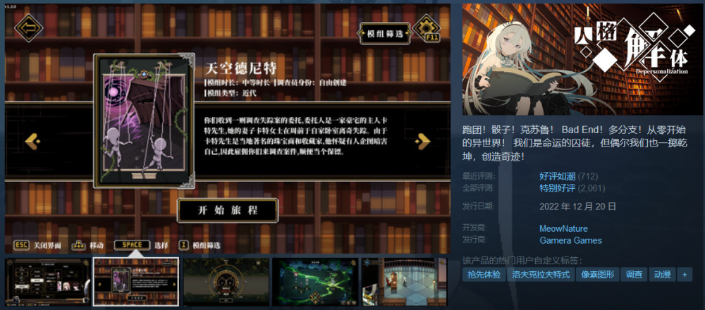 《人格解體》來自國內喵法自然工作室(MeowGames),作為一款克蘇魯神話世界觀下的TRPG。游戲內包含了多個模組,每個故事都有眾多的分支劇情以及結局。玩家在游戲中將能夠遇到猶格·索托斯、星之彩及諸多舊日支配者這些克蘇魯神話粉絲耳熟能詳的元素。