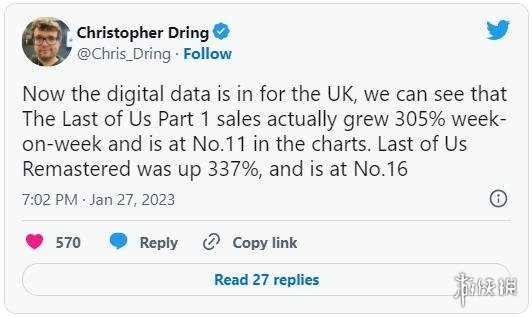 GamesIndustry的Christopher Dring最近在推特上透露,上周PS5《最後生還者:重製版》在英國地區的數字版游戲銷量暴漲,游戲相比前一周增長了305%,躍升至銷量榜的第11位。同樣的,PS4的《最後生還者:復刻版》數字版游戲也增長了337%,排在榜單的第16位。