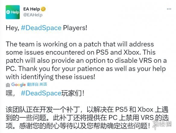 EA Help官推今日表示《死亡空間 重製版》的優化補丁已在開發中,將解決本作在PS5和XSX|S上遇到的一些問題,同時該補丁也將為PC版提供可關閉VRS(可變速率著色:Variable Rate Shading)的選項。