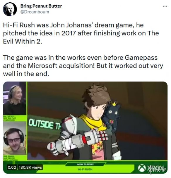 三上真司工作室Tango Gameworks的新作《完美音浪(HiFi Rush)》,發售後大受好評,本作總監Johanas透露他在完成《惡靈附身2》的開發工作之後,於2017年向母公司B社提出了開發《完美音浪》的想法,這是他的夢想,一款非B社風格的遊戲。
