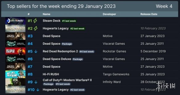 Steam公開新一周(1月23日至1月29日)遊戲銷量排行榜,其中Steam Deck再次來到11連冠,還未發售的《霍格沃茨之遺》大火,奪得第二名的好成績。近日發售的《死亡空間:重製版》更是有四個版本上榜,《荒野大鏢客2》也再次因為折扣關繫上榜,下面讓我們一起來看看吧!