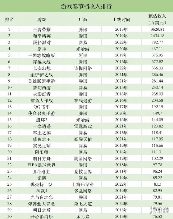 春節七天,騰訊合計收入達6753.18萬美元(約合人民幣4.59億元),佔比超過6成,遙遙領先於其他廠家,其中《王者榮耀》收入超3千萬!