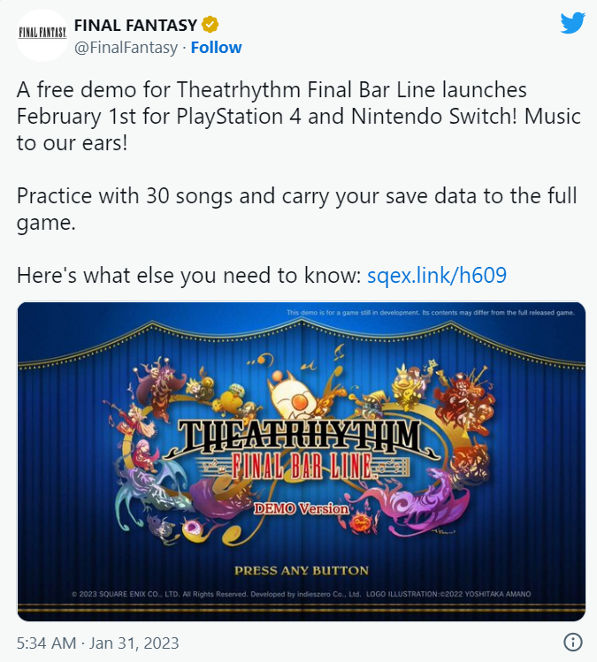 包含FF系列諸多元素的音樂遊戲《節奏劇場:最終幻想》(《Theatrhythm Final Bar Line》)即將在2月16日發售。FF官方在今天宣布遊戲將在2月1日推出試玩Demo,包含30首曲目。另外,官方也將1月30日的直播活動中進行試玩。