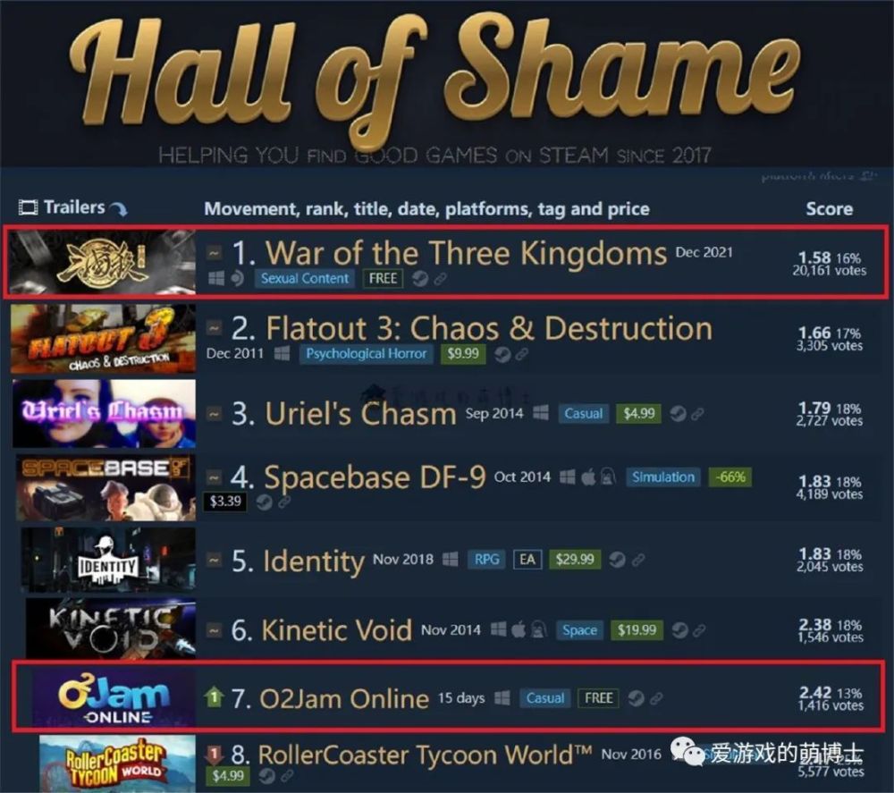 所謂的差評榜,其實是第三方數據網站Steam250出具的一份Steam恥辱殿堂(Hall of Shame)榜單,只有那些獲得了大量差評的遊戲才能入榜,目前的冠軍就是《三國殺》,2萬多條評價中只有16%左右的好評!至於原因的話,原本是桌游的《三國殺》自從轉為線上遊戲後,氪金系統以及平衡性的問題日趨嚴重,而開發商卻視若無睹,於是受傷的玩家們把它送上了差評榜第一的位置。