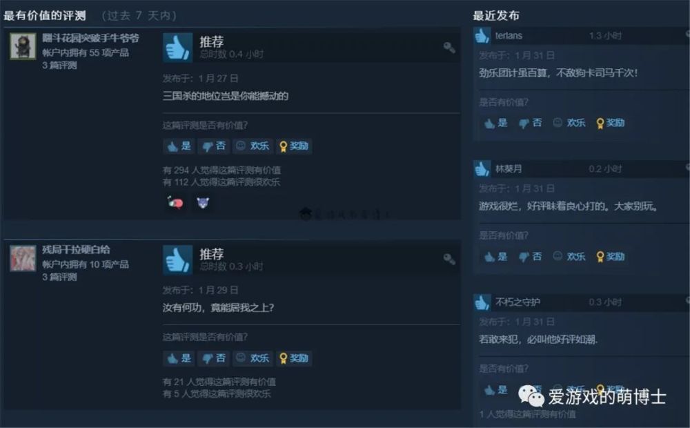 時間來到現在,博士又去看了一下,發現:《勁樂團》的玩家評價雖然還是「差評如潮」,但是好評率卻從4%提升到了13%,莫非開發商做出了及時的應對,挽回了一些口碑?答案是否定的,正如我在標題中所述的那樣,《勁樂團》的橫空出世,威脅到了一直以來的差評榜冠軍《三國殺》的地位,於是粉絲們跑到《勁樂團》那裡刷起了好評,讓人傻眼!