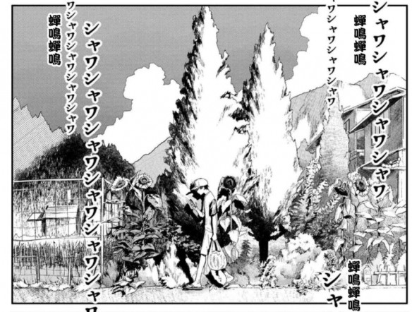 另一方面,作者還善於用擬聲詞營造氣氛,不管是夏日午後嘈雜的蟬鳴,佳記和光互不交流安靜看書時翻書的聲音,還是兩人第一次相互觸碰對方時的心跳,作者都在背景中用不小的畫幅表現。