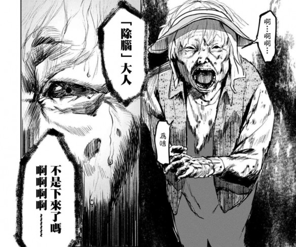 村裡有隻老貓肉哥,平時都很親近人,光想要去撫摸它時卻直接炸毛,村裡還有個老太太認出了光,並稱呼他為「除腦大人」,通過她扭曲的面部表情,讀者也能感受到毛骨悚然。
