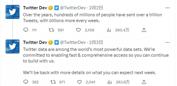 Twitter Dev同時表示,多年來數億人發送超過了一兆條推文,每周都在增加10億計的推文數。推特的數據堪稱世界上最為強大的數據資料集之一,他們將致力於提供快速且全面的存取訪問技術,希望用戶能和與開發團隊一同構造。