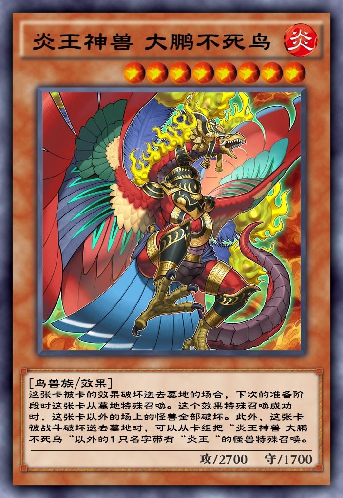 這次炎王補強終於給到了最為關鍵的大鵬不死鳥,這也就意味著我們可以卸掉之前的奈芙蒂斯組件,專門構築純炎王卡組。這張卡被效果破壞送墓的時候,下次准備階段會從墓地特殊召喚,同時通過這個效果特殊召喚成功的時候,可以炸掉這張卡之外場上的所有怪獸,作為現版本最強的清場神器還是非常好用的。同時這張卡如果個戰斗破壞,也可以通過從卡組調度除大鵬不死鳥之外的其他炎王怪獸特殊召喚,整體強度提升了不止一個檔次。