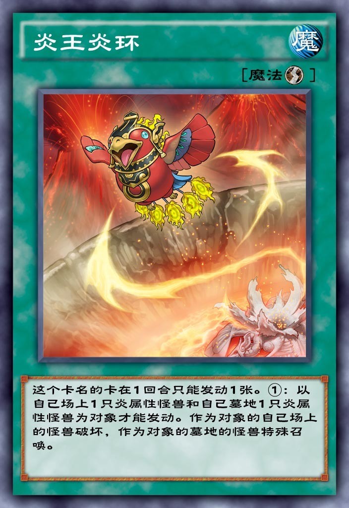 除此之外這次的預組還給到了炎王炎環這張非常好用的二速魔法卡,可以以自己場上和墓地的炎屬性怪獸各一隻為對象發動,場上的怪獸破壞,墓地的怪獸特殊召喚。這一效果主要是用來破壞炎王怪獸觸發效果,之後從墓地特召站場使用的卡牌。同時這張卡也可以作為埋伏卡來連鎖對手取對象的效果來避免counter,靈活性絕佳還是很值得攜帶的。