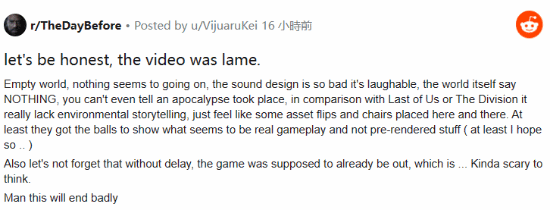 由玩家表示,從實機演示中來看,遊戲中的世界空蕩盪的,音效設計也很糟糕,你甚至無法分辨世界末日是不是已經發生。