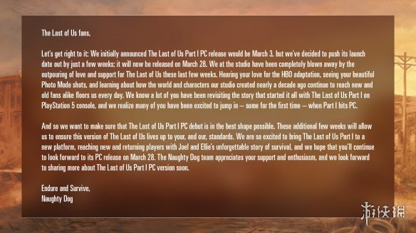 頑皮狗今日零點發布公告,宣布原定於3月4日發售的《最後生還者》PC版將延期至3月28日,即推遲24天。