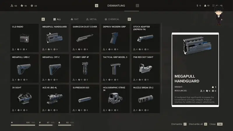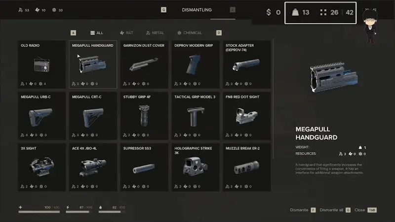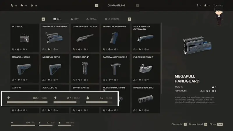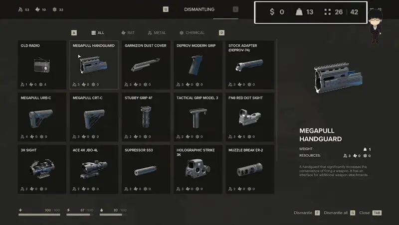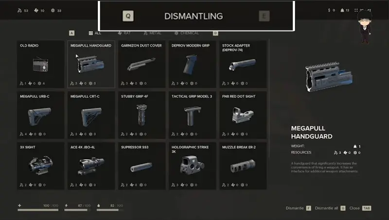 工作台可供拆解物品,製作物品和組裝武器配件,先來了解下常規內容,左上角為金屬零件,組合部件,化學物品,QE快捷鍵對應翻頁,右上角為錢,當前持有總重量,背包占格數和總占格數,左下角為血量,體能,水分三塊