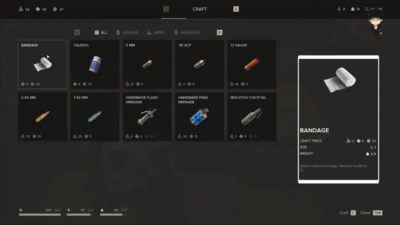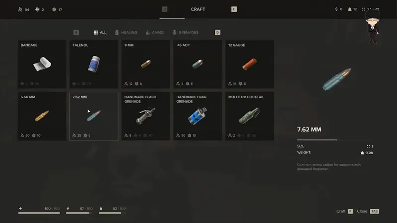 製作界面與拆解界面基本一致,目前能夠製作的物品有綳帶,鎮痛劑,各類常規射擊遊戲出現過的子彈和投擲物,同時製作所需要消耗的材料下面也有對應標註,頁面右邊也有對已選物品做同樣的說明,製作子彈這塊從演示上看,估計數量不是一個個製作,而是一個彈夾上限同時製作,較為便捷
