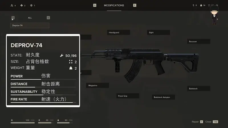 接著是武器配件演示,左上方為當前武器名稱,左下對應著各類參數,老基德這邊直接給大家做了下大致翻譯,方便大家觀看