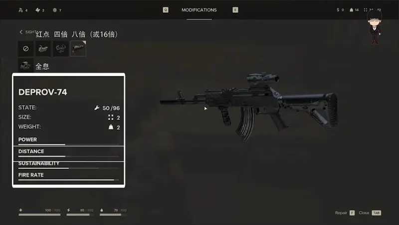 例如這邊換取瞄準鏡的演示,從ICON上表現這四個瞄準鏡分別為紅點,四倍,八倍,全息,這把武器適用性最高的是四倍,紅點和全息只能提升一定程度射擊距離,而八倍鏡從UI屬性上表現,大概率估計和裝四倍鏡的效果一樣