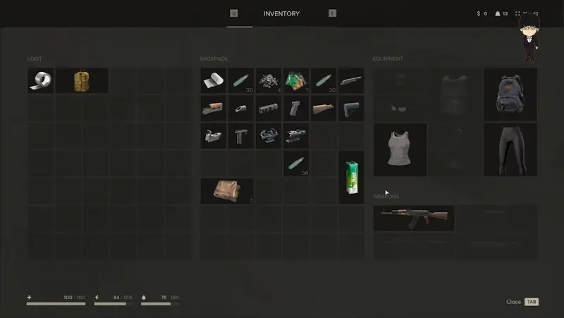 拆解物品主要圍繞金屬,組合和化學三個元素,遊戲中還存在錢的概念,估計還可以通過貨幣進行一部分東西交易,負重和背包格數表現和過去基本一致,此次演示少了體溫這一個參數表現,不知道是因為前期版本暫時未接觸到,還是工作室已經將這一參數玩法移除