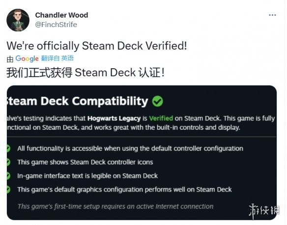 《霍格沃茨之遺》官方社區經理Chandler Wood表示,本作已通過V社掌機SteamDeck驗證,完全可玩。