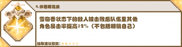 與固有天賦一搭配可以下場後為隊友提供24暴擊率的加成,使得胡桃配合一個接力c更加可能,不過由於行秋夜蘭不鎖面板,所以常見隊伍里並沒有多大提升。