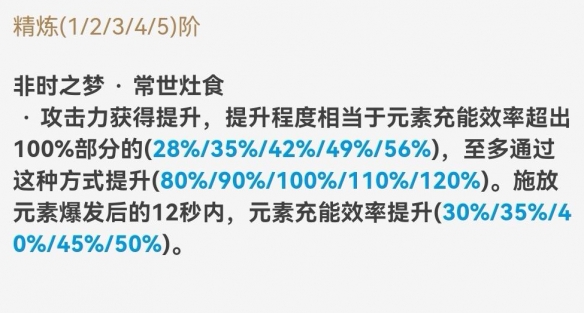 攻擊力獲得提升,提升程度相當於元素充能效率超100%部分的(28%/35%/42%/49%/56%)至多通過這種方式提升(80%/90%/100%/110%/120%)施放元素爆發後的12秒內,元素充能效率提(30%/35%/40%/45%/50%)