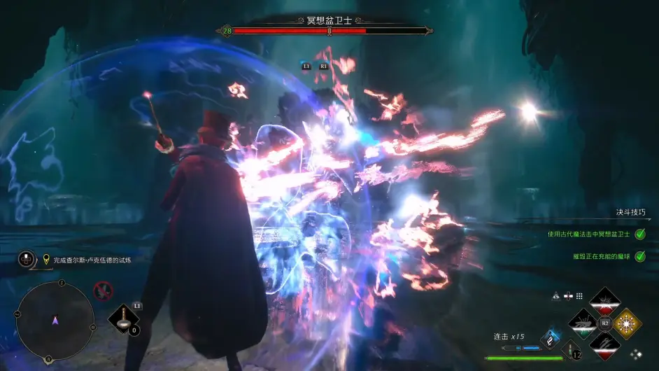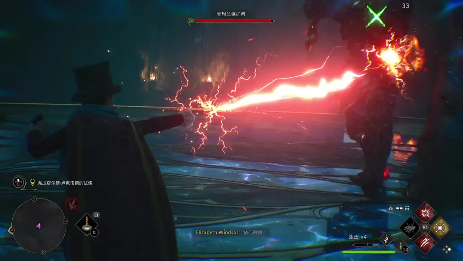 遊戲的戰斗系統是一個亮點。甩魔杖的戰斗看起來有些迷惑,但在即時戰斗的大框架之下,玩家可以通過功能性魔法和傷害魔法的組合完成各種連招,打出多種多樣的效果。在戰斗中,主角的咒語會自動指向鏡頭中高亮的目標,玩家也可以通過鎖定將目標固定在某個敵人身上,或是用左扳機鍵手動瞄準,較為靈活。