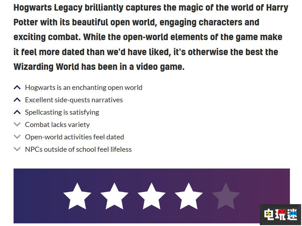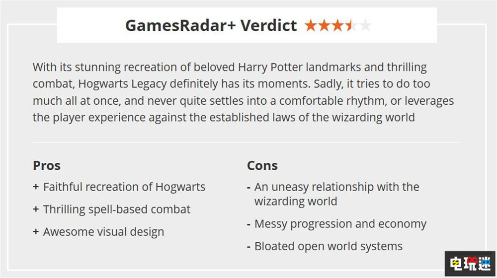 《霍格沃茨之遺》通過迷人的開放世界與激動人心的戰鬥成功抓到了哈利波特世界的魅力。雖然遊戲的開放世界元素讓遊戲比想像中的老套,校外的NPC毫無生氣,但是本作仍是魔法世界遊戲中最好的。