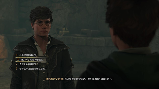 唯一值得肯定的是,在少數幾個與重要同伴展開的支線任務中,遊戲在敘事層面表現出了不錯的深度——尤其是在對角色的情感刻畫上,這些支線劇情所塑造的角色,相比其他支線任務中的站樁聊天NPC,會顯得更加真實且令人動容。這裡以蛇院學生塞巴斯蒂安的系列任務為例,在他的故事中,玩家不光要面對自己良心上「是否學習不可饒恕咒」的抉擇,而且在推進劇情的過程中,玩家也將看到這位最初目的單純的學生,是如何在黑魔法的誘惑下,不斷突破自己內心的道德底線,走向無法挽回的痛苦深淵。