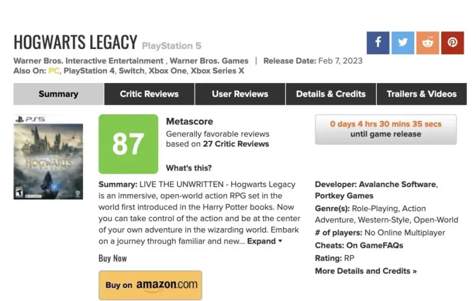 《霍格沃茨之遺》的首批媒體評分公布,據MC網站顯示,27家媒體目前為本作的PS5版共打出87的平均分,媒體普遍認為這是一款引人入勝的遊戲,具有令人難忘的角色、精彩的戰斗等讓這款遊戲增光添彩的要素。