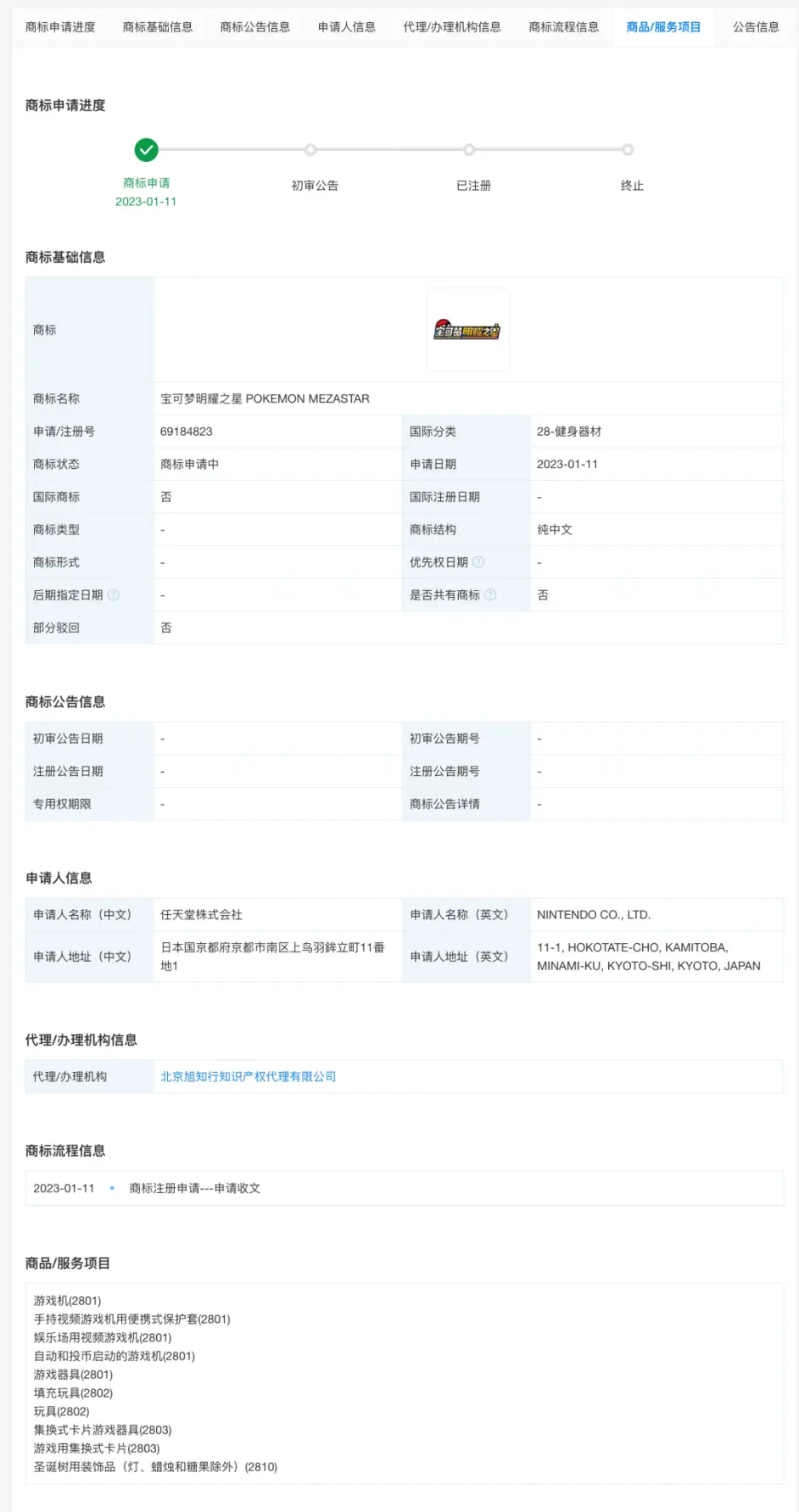 據國家知識產權局顯示,任天堂於1月11日申請註冊了《寶可夢明耀之星》中文商標,共申請了四次,分別為國際分類28-健身器材、41-教育娛樂、16-辦公用品、9-電子器具。